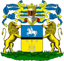 В щите, разделённом посередине чёрной полосой, в верхней половине в голубом поле изображён вооруженный воин, едущий на белом коне в правую сторону. В нижней половине в золотом поле означены два меча и в середине их стрела, остриями соединённые над подковой, которая шипами обращена вверх.