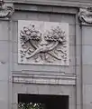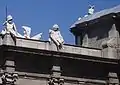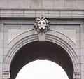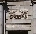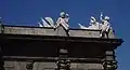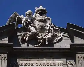 Над центральной аркой, с обеих сторон высечена фраза на латыни с девизом «Rege Carolo III. Anno MDCCLXXVIII» («Будучи Карлом III, 1778 год»). Над надписью внешнего фасада установлена композиция из щита, поддерживаемого Фамой и Гением, по сторонам — фигуры детей.