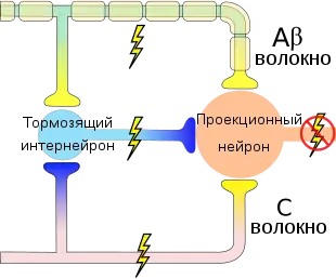 Желатинозная субстанция спинного мозга работает как ворота, контролирующие сенсорный вход от периферических нервных волокон. Она регулирует возбуждающее действие толстых и тонких волокон на вставочные клетки спинного мозга[7].
