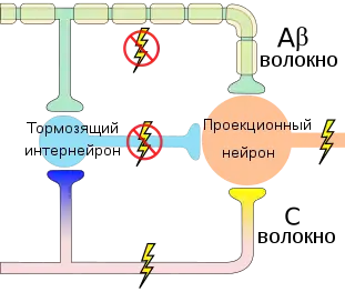 Импульсы, приходящие по толстым волокнам максимально эффективно действуют в начале, а затем их работа тормозится желатинозной субстанцией, поскольку они оказывают возбуждающее действие на клетки желатинозной субстанции, а желатинозная субстанция, в свою очередь, тормозит передачу импульса на терминалях и толстых, и тонких волокон. Импульсы же, передающиеся по тонким волокнам, со временем усиливаются желатинозной субстанцией, поскольку они оказывают на клетки желатинозной субстанции тормозящее действие[7].