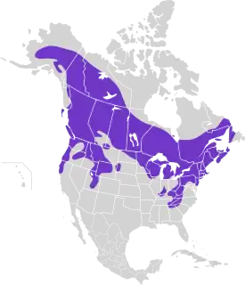 Северная Америка — США, Центральная Аляска, Канада. Птицы обитают в хвойных (сосновых, еловых) и лиственных лесах; на открытых участках (дороги, луга, пахотные земли); в районах, граничащие с тундрой и прериями. Также населяет скалистые склоны гор и холмов, покрытые вечнозелеными деревьями и мелким кустарником. Поднимается в горы на высоты до 1060 м над уровнем моря.