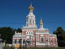 Церковь представляет собой неоштукатуренное здание из красного кирпича и имеет форму корабля, его венчали три купола. Три придела внутри разделены глухими перегородками и по сути являются изолированными церквями. Углы фасада украшены по горизонтали белыми полосками, окна украшены лепниной в русском стиле.