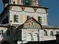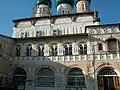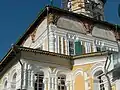 Галерея покоится на сводчатых арках, в глубине которых расположены окна нижнего храма. В прошлом нижняя аркада была открытой, сейчас она остеклена. Центральная часть храма освещается через окна, расположенные над окружающей храм галереей, и световые барабаны. Небольшие окна есть также и между центральной частью и галерей. Приделы располагаются на галерее, имеют маленькие главки на глухих барабанах. С южной (обращенной к центру города) и западной стороны у храма есть крыльца, ведущие на галерею. Оба крыльца расположены не по центру, а смещены влево. Стены северного придела укреплены контрфорсами. Алтарная часть имеет два яруса тройных полукруглых апсид.