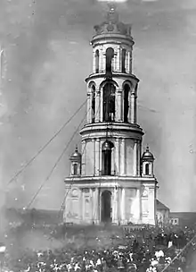В 1810 году итальянский архитектор Яков Маричелли начал строительство колокольни Воскресенского собора. В 1819 году колокольня, выведенная до четвёртого яруса, рухнула. Завершено строительство было только в 1833 году крестьянином Владимирского уезда Михаилом Саватеевым под руководством губернского архитектора Евграфа Петрова. Высота колокольни от основания до оконечности креста была 49 сажен 2 аршина, шпиля — 10 сажен 1 аршин. Шпиль был обит белым железом, а яблоко и крест на нём вызолочены[1].
