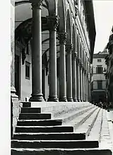 Благодаря Брунеллески, как сообразно терминологии своего времени писал Огюст Шуази, было принято «решение византийское, а не классическое»[4]. Именно в Италии периода кватроченто «встретились греческая колонна и арабская арка, произведя на свет образ лёгкой, воздушной, пружинящей ордерной аркады. Освободившись от стены, колонна стала стоять свободно. Эта прекрасная идея, отражающая дух эпохи Возрождения, положена в основу многих композиций и в дальнейшем стала узнаваемым почерком работы итальянских архитекторов, в том числе за пределами своей страны»[5].