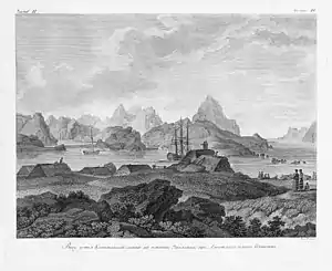 ![]() Сарычев Г. А. Вид Капитанской гавани острова Уналашка. Конец XVIII века | |||