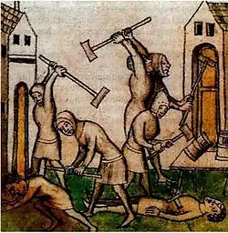 Впрочем, этого народу и здесь же присутствующей цеховой верхушке оказалось мало, они потребовали от герцога санкций против евреев, многие из которых в то время давали деньги в рост в обмен на особый налог в пользу казны. Получив в том отказ, парижане взялись за оружие и, разгромив еврейский квартал, убили раввина и нескольких богатых иудеев-ростовщиков, сожгли их дома и долговые расписки, разграбив и присвоив себе имущество жертв[10]. При этом, по словам хрониста Жана Фруассара, пострадало немало небогатых евреев, живших на улице Тампль, некоторые из них были насильно окрещены в церкви Сен-Жермен на Гревской площади[11].