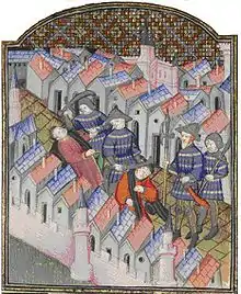 Так или иначе, возмущение толпы выплеснулось наружу. Ремесленники подняли белое полотняное знамя (знак солидарности с восставшим Гентом)[19], толпа бросилась в арсенал, где вооружилась, среди прочего, двумя или тремя тысячами боевых молотов, окованных свинцом, за что восставшие получили в истории имя майотенов, или молотобойцев. Основной движущей силой восстания были подёнщики, мелкие торговцы, подмастерья и городская беднота[20]. Запылали отели знати на правом берегу Сены, среди прочих — отель герцога Анжуйского; было убито и ограблено множество богатых горожан, торговцев и ростовщиков, разбиты были винные склады. Не оставили без внимания также евреев: множество из них погибло, часть была вынуждена принять насильственное крещение. Городской капитан Морис де Трезегиди с горсткой солдат попытался остановить мятеж, но разъярённая толпа вынудила его к бегству, королевский гарнизон был заперт в Большом Шатле[21]. К 12 часам дня город был в руках у восставших, поперёк улиц были натянуты цепи, ворота столицы закрыты. Для того, чтобы никто не смог бежать из Парижа или проникнуть в город, на стенах денно и нощно отныне должна была нестись караульная служба; также, если верить Фруассару, в городе был введён комендантский час («и вышедший из своего дома после одиннадцатого удара, ежели не был их приспешником, мог почитать себя мертвецом»)[19].