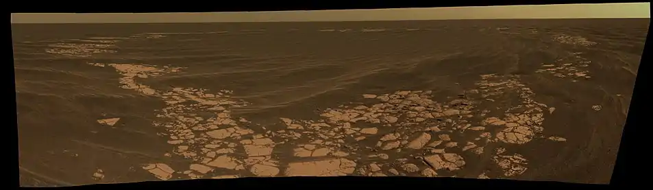 В кратере «Оппортьюнити» исследовал камень «Гагарин», названный в честь космонавта Юрия Гагарина, а также образец почвы под названием «Лайка». Ровер вышел из кратера на 404 сол, и направился на юг в сторону кратера Эребус — эродированного кратера, более крупного, чем кратер Эндьюранс, — и ещё большего (750-метрового) кратера Виктория.