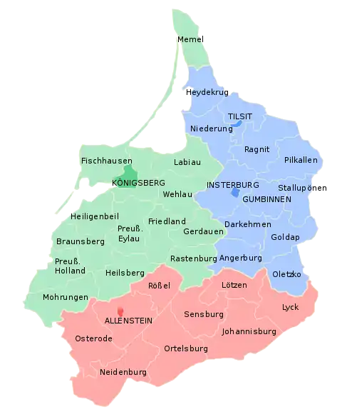 1 ноября 1905 года из южных частей округов Кёнигсберг и Гумбиннен был образован самостоятельный округ Алленштейн[4]. 10 января 1920 года в соответствии с решениями Версальского договора Мемельланд выходит из состава Пруссии и переходит под управление Лиги Наций, а части района Найденбург (округ Алленштейн) переходят под контроль Польши. В то же время под управление Восточной Пруссии переходят город и район Эльбинг (ранее входившие в округ Данциг провинции Западная Пруссия).