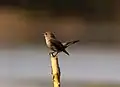 У самок верхние части тела коричневые, а хвост черноватый, но окаймлен белым. Нижние части тела преимущественно белые. Во время брачного периода у самцов горло окрашено в оранжево-красный цвет.