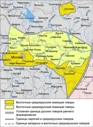 Восточные среднерусские акающие говоры размещаются к югу от Владимирско-Поволжской группы и примыкают к говорам южнорусского наречия в их северной части, занимая территории большей части Московской области (на западе, в центре и на востоке), северо-востока Рязанской области, южных районов Нижегородской области, восточной части Мордовии и северо-запада Пензенской области. Северо-западную часть Костромской области занимают чухломские говоры.