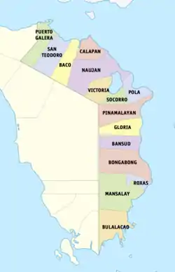 Муниципалитеты, входящие в провинцию Восточный Миндоро: Пуэрто-Галера, Сан-Теодоро, Бако, Калапан, Наухан, Виктория, Пола, Сокорро, Пинамалайян, Глория, Бансуд, Богабонг, Рохас, Мандалай, Булакао.