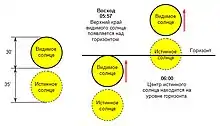 При наблюдении с Земли угловой диаметр солнечного диска составляет 32 угловые минуты (0,53°, 1/108 рад)[2]. Следствием отмеченного факта, а также формального определения восхода как момента появления верхнего края солнечного диска над горизонтом и определения заката как момента пропадания верхнего края солнечного диска за горизонтом является то, что продолжительность дня оказывается несколько больше половины солнечных суток.