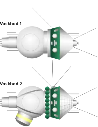 Космический аппарат «Восход» базировался на конструкции корабля Восток, но была добавлена резервная твердотопливная тормозная двигательная установка и ионная система ориентации. Появилась и система мягкой посадки спускаемого аппарата — перед приземлением из СА выдвигался щуп длиной около метра, и при касании его поверхности земли срабатывал двигатель мягкой посадки, гасивший скорость снижения СА до нуля, по крайней мере, вертикальную компоненту. Это позволило отказаться от катапультирования, которое было необходимо на КК «Восток» из-за сильного удара СА о землю. Отказ от катапультных кресел позволил вместить трёх членов экипажа, правда, с ужесточением требований к росту (особенно росту сидя). Но, с другой стороны, отказ от системы катапультирования исключал возможность спасения экипажа в случае аварии ракеты-носителя на первых этапах взлёта, что вносило повышенный риск.