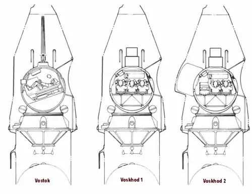 - Как вспоминает академик В. Мишин, Хрущёв потребовал от Королёва запустить трех космонавтов сразу. Но кабина «Восхода» была рассчитана на двух человек в скафандрах, поэтому пришлось усаживать космонавтов в лёгких тренировочных костюмах без скафандров. Также не было места разместить три катапульты, потому летели без возможности аварийного спасения в случае взрыва ракеты на старте.