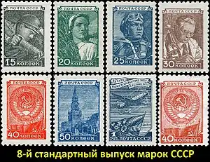 В октябре 1948 года в обращение поступил восьмой стандартный выпуск, состоявший из марок семи номиналов. Он повторял рисунки предыдущего выпуска, выполненные Василием Завьяловым, однако были несколько изменены цвета и номиналы: шахтёр — 15 копеек, колхозница — 20 копеек, лётчик — 25 копеек, учёный — 30 копеек, герб и флаг СССР — 40 копеек, Спасская башня Московского кремля — 50 копеек. Марка номиналом в 1 рубль вышла в увеличенном формате и с новым рисунком — самолёт и флаг ВВС СССР. Марки печатались офсетным способом. Существует два различных размера рисунка марки в 15 копеек и пять различных размеров марки в 40 копеек[1][2].