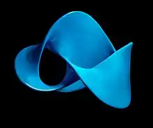 ![]() Простое прямоугольное изображение узла «восьмёрка». | ![]() Симметричное изображение, полученное из параметрических уравнений. | ![]() Поверхность с границей образованной восьмеркой |