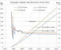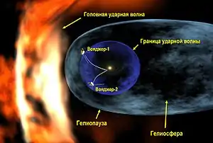 В 2004 году на расстоянии 94 а.е. от Солнца «Вояджер-1» пересёк границу ударной волны, создаваемой снижением скорости солнечного ветра ниже скорости звука в составляющей его плазме. Аппарат оказался в области, называемой гелиосферной мантией (англ. heliosheath)[3], где солнечный ветер ведёт себя как упругий газ, сжимаясь и разогреваясь от взаимодействия с межзвёздной средой.