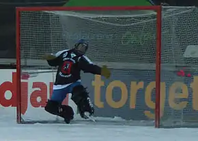 В хоккее с шайбой вратарь носит специальное снаряжение, состоящее из усиленного панциря, шлема, щитков, ловушки, блина и специальной клюшки. Вратарь может прижимать шайбу ко льду или зажимать её в ловушке, чтобы остановить игру (для этого он должен удерживать шайбу в течение трёх секунд). Нападение на вратаря считается нарушением.