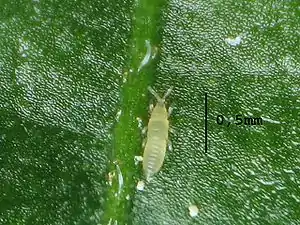 Длина тела взрослых насекомых 2—2,5 мм. Имеет две пары крыльев. В спокойном состоянии, они сложены в узкую светлую полоску на спинке насекомого и практически не видны. Взрослые насекомые, обычно, имеют тёмную окраску — чёрную, или буроватую. Личинки большинства видов — жёлтые, или зеленоватые, трудно различимые на поверхности листовой пластинки. На орхидных наиболее обычны два вида: трипс оранжерейный (Heloithrips haemorrhoidalis) и трипс табачный (Thrips tabaci). Ведут скрытный образ жизни. Поражают цветки, листья и туберидии. На поврежденных листьях появляется характерная серебристая окраска с массой точечковидных тёмных экскрементов. Со временем пораженные участки буреют. Трипсы откладывают яйца в ткань листьев. Чаще всего повреждаются туния, цимбидиум, эпидендрум, фаюс, ангулоа, стеноринхус, спатоглоттис, катазетум и др.