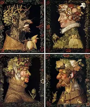 Картины из цикла «Времена года» («Весна», «Лето», «Осень», «Зима») — это аллегорические портреты четырёх времён года. Символизируют периоды человеческой жизни — юность, молодость, зрелость и старость. Портреты составлены из фруктов, овощей, цветов и других растительных элементов, характерных для каждого времени года. Таким образом, юная Весна вся состоит из трав и множества благоухающих цветов. Молодое пышное Лето, одетое в соломенную блузу, построено из фруктов и овощей. Осень в образе зрелого весёлого человека собрана из спелых фруктов и корнеплодов. И наконец, Зима — немощный старик, созданный из старого пня и покрытый символическим плащом из соломы. Эти точно выписанные элементы природы объединены художником в сложную человеческую форму. Каждую картину обрамляет цветочная гирлянда. Предположительно, цветочные обрамления были дописаны другим художником в XVII веке[5]. Беспрерывный круговорот «Времён года» был также символом стабильности господства династии Габсбургов перед лицом религиозных волнений и турецкой угрозы[4].