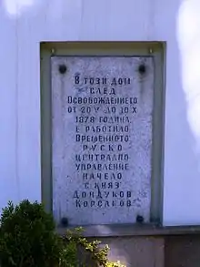 Временное русское управление возглавлял первоначально императорский комиссар князь В.А. Черкасский, в качестве начальника «Первой канцелярии гражданского управления освобожденными задунайскими землями». После его смерти в марте 1878 года во главе управления встал князь А.М. Дондуков-Корсаков.[1] С 20 мая по 10 октября 1878 г., резиденция комиссара находилась в Пловдиве, а затем была перенесена в Софию.