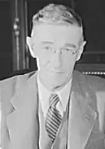 Сам Стимсон был председателем. Другими членами были: Джеймс Ф. Бирнс, бывший сенатор США, который вскоре станет государственным секретарем, в качестве личного представителя президента Трумэна; Ральф Бард, заместитель министра флота; Помощник госсекретаря Уильям Л. Клейтон ; Ванневар Буш, директор Управления научных исследований и разработок и президент Института Карнеги; Карл Т. Комптон, начальник отдела полевой службы в Управлении научных исследований и разработок и президент Массачусетского технологического института; Джеймс Б. Конант, председатель Национального исследовательского комитета по обороне и президент Гарвардского университета; и Джордж Л. Харрисон, помощник Стимсона и президент компании по страхованию жизни в Нью-Йорке. Харрисон возглавлял комитет, когда Стимсон отсутствовал, но Бирнс, как личный представитель президента, был, вероятно, его самым влиятельным членом.[1]