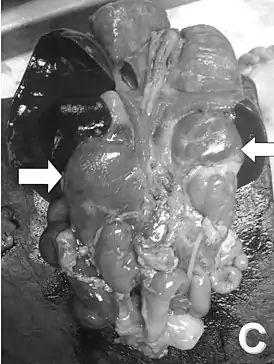 ![]() Вскрытие новорождённого. Стрелками указаны увеличенные надпочечники | |