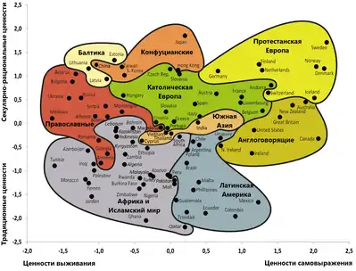 Например, Россия, с одной стороны, близка по ценностям к полюсу выживания, с другой стороны — рационалистична, как Германия, Норвегия и Дания[5]. Примеры стран с выраженными традиционными ценностями — США, Ирландия, почти все страны Латинской Америки, Индия.