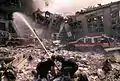 Повреждённый World Center Hotel (справа), перед которым была церковь