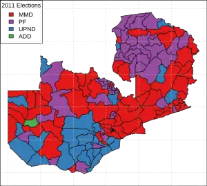 Всеобщие выборы в Замбии проходили 20 сентября 2011 года[1]. На них избирались президент, депутаты Национальной ассамблеи и представители местных органов власти. Майкл Сата от Патриотического фронта победил на президентских выборах, опередив действующего президента Рупиа Банду из Движения за многопартийную демократию, и 23 сентября был приведен к присяге. Патриотический фронт стал самой крупной партией в Национальной ассамблее, получив 60 из 148 мест, определённых в день выборов.