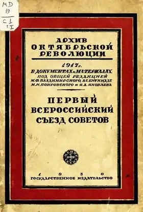- Первый Всероссийский съезд Советов рабочих и солдатских депутатов // Большая советская энциклопедия : [в 30 т.] / гл. ред. А. М. Прохоров. — 3-е изд. — М. : Советская энциклопедия, 1969—1978.