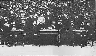 Слева направо (сидят): А. К. Рубинштейн, М. Венгеров, Г. С. Сальве, М. И. Чигорин, М. Лохтин, ..., В. Н. Юревич, О. С. Бернштейн, Э. С. Шифферс, Ф. И. Дуз-Хотимирский