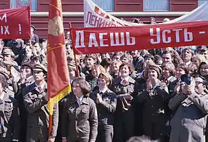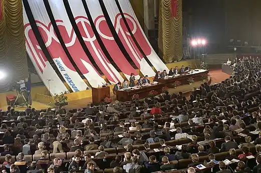 - Alexey Kurbatov. Русский: (21-й) XXI съезд ВЛКСМ 11 апреля 1990 года в Москве. Лозунг на съезде в период перестройки "За демократический социализм".English: XXI Congress of the Komsomol April 11, 1990 in Moscow. The slogan of the Congress during the period of adjustment "For democratic socialism" (11 апреля 1990). Дата обращения: 18 марта 2020.