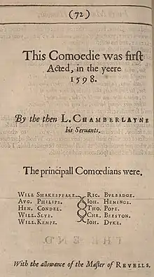 По театральному преданию, записанному в 1709 году Николасом Роу, именно Шекспир убедил труппу принять комедию новичка к постановке, в то время как другие пайщики были склонны отвергнуть её.
