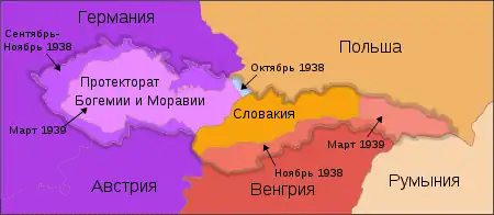 30 сентября 1938 года было подписано Мюнхенское соглашение, согласно которому нацистской Германии передавалась Судетская область, где проживало немецкое национальное меньшинство (судетские немцы). Кроме того, Чехословакия 1 октября 1938 года лишилась Заользья, где проживало польское население, оккупированного Второй Речью Посполитой. В ноябре Венгрия согласно решению Первого Венского арбитража оккупировала Южную Словакию и юг Карпатской Руси с Ужгородом и Мукачево, где проживало венгерское меньшинство.