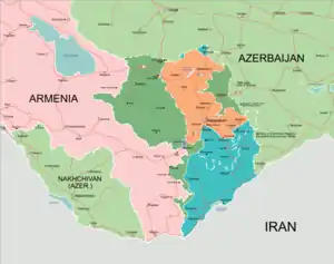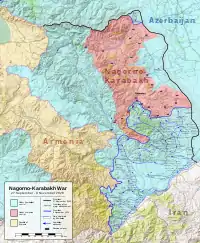 Этническое насилие, проявившееся в регионе в конце 1980-х годов, привело к самопровозглашению Нагорно-Карабахской Республики (НКР), а после распада СССР переросло в полномасштабную войну[46], завершившуюся в 1994 году подписанием соглашения о прекращении огня[47][48]. С тех пор регион полностью находился под контролем НКР, которую поддерживает Армения[49][50][51][52][53], причём формирования НКР контролировали не только заявленную при провозглашении независимости территорию, но и прилегающие к ней районы, которые до войны имели преимущественно азербайджанское население (так называемый «пояс безопасности Нагорного Карабаха») — Агдамский, Джебраильский, Физулинский, Кельбаджарский, Губадлинский, Лачинский и Зангеланский районы. Впоследствии эти территории были включены де-факто властями НКР в её административно-территориальную структуру[54]. Подавляющее большинство населения этих районов в результате боевых действий было вынуждено покинуть свои дома.