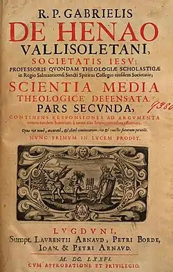 Иезуиты в лице Луиса де Молины, Габриэля де Энао, Франсуа Анна, Леонард Лессий, Роберт Беллармин и Франсиско Суареса решали проблему с помощью концепции «scientia media» («среднего знания»)[22], согласно которой Бог знает объективную реальность вещей, что сделал бы человек при любых обстоятельствах, в которые он мог бы быть помещен. Предвидя, например, что человек будет свободно соответствовать благодати A и что он свободно не будет соответствовать благодати B, Бог, желая обратить человека, дает ему благодать A. Это и есть действующая благодать. Концепция Луиса де Молины по согласованию свободной воли и благодати впоследствии получила название по имени своего создателя — молинизм. Франсуа Анна (François Annat, 1590-1670), став известным академической среде в 1632 году, опубликовал трактат «Scientia media contra novos eius impugnatores defensa» в защиту иезуитского учения о Божественной благодати против ораторианца Гийома Жибьёфа (Guillaume Gibieuf, 1583–1650). В 1644 году он продолжил знаменитую полемику, стремясь примирить человеческую свободу с действующей Божественной благодатью.