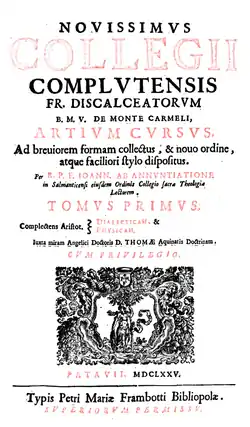 В сотрудничестве с другими кармелитами Антонио де ла Мадре де Диос (Antonio de la Madre de Dios, 1583-1637) создал энциклопедию, предназначенную для студентов, изучающих искусства и философию, в качестве справочника к «Summa Theologica» Фомы Аквинского. Этот 2-х томный труд первоначально назывался «Collegium Complutense philosophicum, hoc est artium cursus, sive disputationes in Aristotelis dialecticam et philosophicam naturalem, juxta Angelici Doctoris D. Thomae doctrinam et ejus scholam» («Философские сочинения коллегии Комплутума, т. е. курс искусств или рассуждения по диалектике и натурфилософии Аристотеля согласно учению ангельского Доктора Фомы и его школы»). Сначала курс содержал трактаты по логике, написанные Мигелем де Тринитатом (Michael de Trinitate, 1588–1661), но со временем были добавлены трактаты по метафизика и нравственная философия.