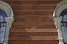 | Декор фасада | Одна из заштукатуренных звёзд Давида | Сохранившийся фрагмент кирпичной ограды |