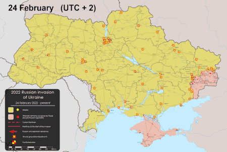 24 февраля, около 6 часов утра по московскому времени, вскоре после завершения трансляции обращения Владимира Путина, были нанесены ракетные удары по объектам военной инфраструктуры на всей территории Украины — аэродромам, объектам ПВО, пунктам управления, складам и т. п. Российские войска, а также войска ЛНР и ДНР перешли в наступление, нанося удары по следующим направлениям: с севера — на Припять и Чернигов (в том числе с территории Белоруссии), с востока — на Конотоп, Сумы, Харьков, Ахтырку, а также с линии соприкосновения с ЛНР и ДНР — на Станицу Луганскую, Волноваху и Мариуполь, с юга (со стороны Крыма) — на Херсон, Новую Каховку, Мелитополь[127][128][129].