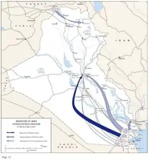 Вторжение США и их союзников в Ирак — военная операция США и её стран-союзников против Ирака, предпринятая в 2003 году с целью свержения режима Саддама Хусейна. Военные действия против иракской армии начались 20 марта и закончились 9 апреля, когда американские войска заняли столицу Ирака город Багдад. 1 мая президент США Джордж Буш-младший объявил об окончании активных боевых действий. Операция проводилась на основании резолюций Совета безопасности ООН № 687 и 1441[13], без дополнительной санкции ООН.