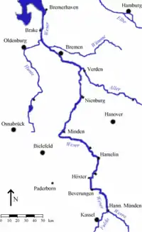 Перед лицом этого наступления меньшая по численности немецкая наблюдательная армия отступила обратно за реку Везер на территорию самого Ганноверского электората, в то время как Камберленд пытался подготовить свои войска. 2 июля прусский порт Эмден пал перед французами, прежде чем туда смогла добраться эскадра Королевского флота, посланная на его помощь. Это отрезало Ганновер от Голландской республики, а поставки из Великобритании теперь могли осуществляться только прямым морским путем.[3] ранцузы последовали за этим, захватив Кассель, обеспечив свой правый фланг.[4]