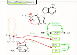 - Гидрофобные молекулы: нерастворимые в воде молекулы, такие, как диацилглицерин и фосфатидилинозитол, которые связываются с мембранами клетки и диффундируют с цитоплазматической мембраны клетки по межмембранным пространствам на внутренние клеточные мембраны, включая мембрану ядра и ядрышка, где они могут «добраться» и воздействовать на мембранно-связанные вторичные эффекторные белки;