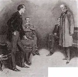 Холмс предполагает, что организовать похищение такого важного документа могут только три афериста международного класса: Оберштейн, Ля Ротьер и Эдуард Лукас[4]. Но Ватсон читает в газете, что накануне Лукас был убит в собственном доме. Холмс сразу же высказывает предположение, что похищение письма и убийство обязательно связаны между собой[5]. Неожиданно Холмса посещает жена министра, леди Хильда Трелони Хоуп. Она умоляет Холмса рассказать, что за документ пропал у её мужа, но Холмс категорически отказывается говорить об этом. Он только подтверждает догадку леди Хильды, что в случае, если документ не будет найден, карьере Трелони Хоупа придет конец.