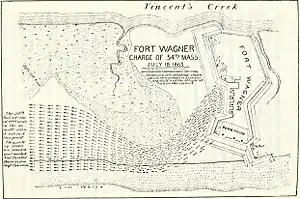 Форт Вагнер (получивший имя в память о погибшем подполковнике Томасе Вагнере из Южной Каролины[1]) прикрывал с тыла стратегически важную батарею Грегг на северной оконечности острова Моррис. В документах конфедератов форт Вагнер обычно называется батареей, однако за время осады укрепление было приспособлено для круговой обороны и стало одним из сильнейших пунктов обороны Чарлстона. В 150—200 метрах перед фортом остров суживался до полосы песка шириной 55 метров, ограниченной океаном с восточной стороны и заболоченной протокой Винсентс-Крик с западной. Таким образом, атаковать форт можно было только полковой колонной. Преодолев узкий перешеек, атакующие оказывались перед южным фасом форта длиной 250 метров, который перекрывал остров по всей ширине от реки до океана. Форт был окружён неглубоким рвом, усиленным заострёнными пальмовыми бревнами. Дно рва со стороны океана под водой было устлано досками с заострёнными шипами.