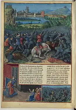 Почти в то самое время, когда Конрад потерпел страшное поражение, Людовик VII приближался к Константинополю. Происходили обычные столкновения между французским войском и византийским правительством. Зная симпатии между Людовиком VII и Рожером II, Мануил не считал безопасным продолжительное пребывание в Константинополе французов. Чтобы поскорее отделаться от них и понудить рыцарей к ленной присяге, царь Мануил употребил хитрость. Между французами был пущен слух, что немцы, переправившиеся в Азию, быстро подвигаются вперёд, шаг за шагом одерживают блистательные победы; так что французам нечего будет делать в Азии. Соревнование французов было возбуждено; они требовали переправить их поскорее через Босфор. Здесь уже, на Азиатском берегу, французы узнали о несчастной участи немецкого войска; в Никее свиделись оба короля, — Людовик и Конрад, и решились продолжать путь вместе, в верном союзе.