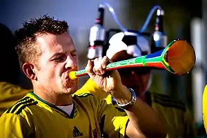 Вувузела в руках болельщиков сборной Бразилии по футболу в День Вувузелы.