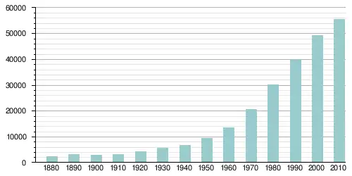 Из 18 721 домашних хозяйств 51,9 % представляли собой совместно проживающие супружеские пары (25,9 % с детьми младше 18 лет), в 14,1 % семей женщины проживали без мужей, в 6,3 % семей мужчины проживали без жён, 27,6 % не имели семьи. В среднем домашнее хозяйство ведут 2,91 человек, а средний размер семьи — 3,41 человека. Население города по возрастному диапазону по данным переписи 2010 года распределилось следующим образом: 27,5 % — жители младше 18 лет, 4,3 % — между 18 и 21 годами, 57,3 % — от 21 до 65 лет и 10,9 % — в возрасте 65 лет и старше. Средний возраст населения — 33,7 года[4].